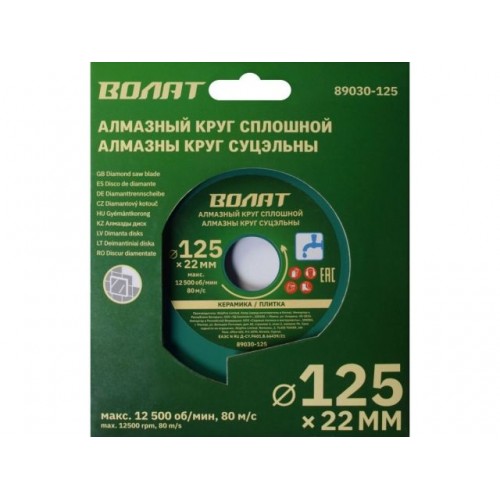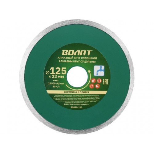 Алмазный круг 125х22 мм по керамике сплошн. ВОЛАТ (мокрая резка)