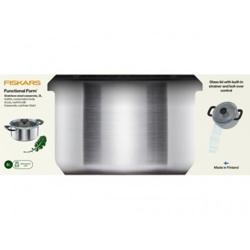 Кастрюля с крышкой Fiskars Functional Form™ (1072316) объёмом 3 литра на 90 % изготовлена из прочной переработанной нержавеющей стали и может использоваться на всех плитах, включая индукционные. Кастрюля оснащена внутренним индикатором жидкости и стеклянной крышкой. Продуманная конструкция посуды, крышка с контролем кипения и встроенное сито. Кастрюлю легко мыть, можно мыть в посудомоечной машине, а также использовать в духовке при температуре до 150°C.