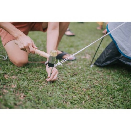 Установка колышков: Вставьте колышки в землю под углом примерно в 45 градусов к поверхности. Этот угол помогает им лучше удерживать натянутый шнур палатки. В случае, если почва твердая, используйте молоток или специальный колышек для внедрения колышков.