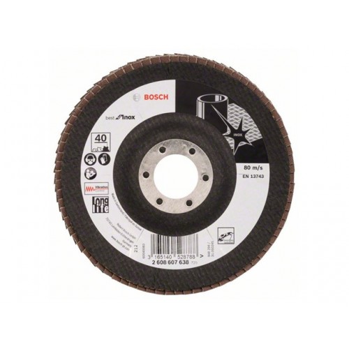 Лепестковый шлифкруг X581 BOSCH Best for Inox 125 мм К 40, угловое исполнение – EN 13743 применяется для обработки высококачественной (нержавеющей) стали.