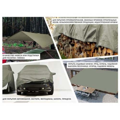 Предназначен для укрытия автомобиля (машиныавто), скутера, мотоцикла, катера, прицепа, стройматериалов, оконных проемов строительных лесов, сельскохозяйственной продукции, недостроенной кровли. Идеален для использования в походах в качестве навеса или подстилки для палатки, гамака. Подходит для укрытия и защиты объектов в промышленности, сельском хозяйстве, садоводстве и транспорте.